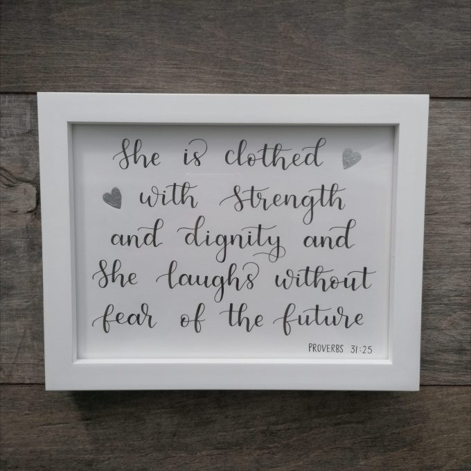 Handwritten bible verse (NOT PRINTED) with silver leaf hearts. Design is in a 20 x 15cm white frame.